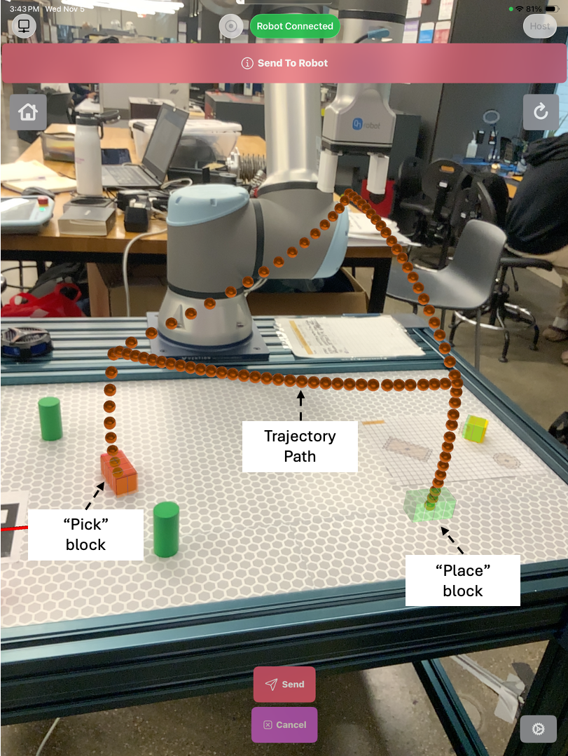 The proposed system supports spatially registered interaction between a human operator and a collaborative robot during pick-and-place and stacking tasks. The MR-App enables a user to define, visualize, and verify manipulation goals directly within the robot’s workspace using an egocentric mobile interface.